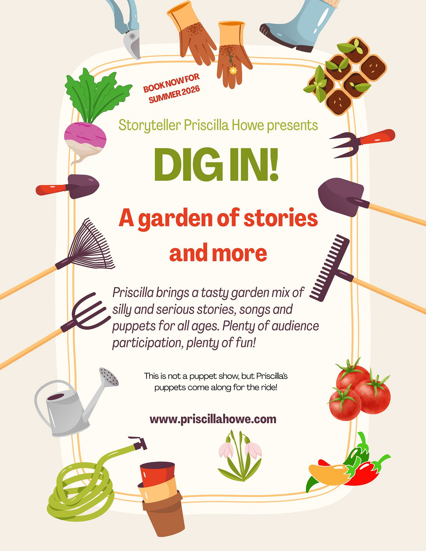 My main bread-and-butter in the summer is performing at libraries. Most libraries follow the Collaborative Summer Library Program themes (if you’re a performer, check out the website for the themes several years ahead). This year, it’s Unearth a Story,tm focused on dinosaurs, paleontology, and archaology. Hmm. Not in my wheelhouse, so I have shifted to a dirt-adjacent theme with a program I’m calling Dig In! A Garden of Stories (no trademark, because I’m not that fancy). So far, I’m thinking about kid-friendly tales such as “The Turnip” and “The Goat in the Chili Patch,” and songs like “Oats, peas, beans and barley.” I’m playing around with which puppets will turn up (or turnip?). I do have a goat puppet that might work well. Suggestions?